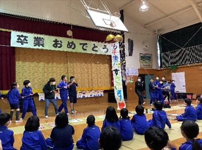 3月2日に、6年生を送る会を行いました。今年は、5年生が相談し、6年生に感謝の気持ちを伝えて全校のみんなが笑顔になれるような会にしようと「スマイル集会」と名付けました。6年生と1年生が手をつないで入場するオープニングや、6年生の名前を使った全校遊びなどで、和やかなムードで始まりました。