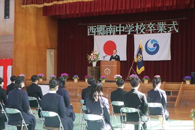 3月15日に令和4学年度卒業証書授与式が挙行されました。3年間、コロナウィルス感染拡大にともない、様々なことを我慢してきた卒業生。修学旅行も2度の延期がありました。しかし、それでも文句を言うことなく西郷南中学校を全力で盛り上げてきた姿はとても立派でした。そんな卒業生を全校生徒、保護者、全職員、地域の皆さんで送ることができ、感動的な式となりました。卒業生がそれぞれの道で、精一杯頑張ってくれることを心より願っています。