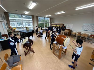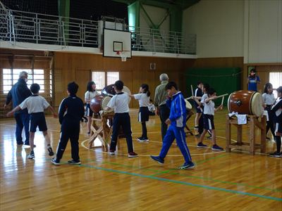 そして迎えた3月8日、1・2年生をゲストに発表会を行いました。緊張の面持ちでしたが、いざ始まると自信を持って太鼓を打ち、「ヤトセー、ヤトセー」などの大きな掛け声や1・2年生に分かりやすく踊りを教えるなど、学んだことを伝えようと頑張っていました。