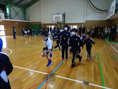 なわとび大会後の短期間でしたが、マラソン強化週間を行ったところ、記録更新に向けて朝マラソンを全力で走る児童が多く、子ども達のやる気を感じました。当日は、ゴールラインを越えるまで最後の力を振り絞って走りきろうとする姿や、走っている児童の側に駆け寄って声援を送るほほえましい姿が見られました。