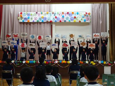 5年生を中心に計画し、「感謝の気持ちをわすれずに、全校が笑顔で終われる会にしよう。」をスローガンに1~5年生で準備を進めました。