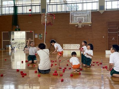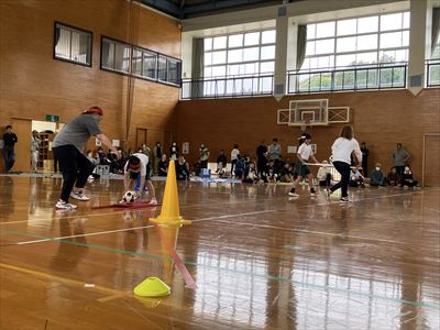 5月14日に中地区体育大会が4年ぶりに開催されました。子どもたちは、ボール運びリレーやフラフープ送り競争など、地域の方と一緒にいろいろな競技に参加しました。余興や餅投げもあり、会場全体が大いに盛り上がりました。あいにくの雨で体育館での開催となりましたが、地域の方が大勢集まり、子どもたちは交流を深め、にぎやかで楽しい一時となりました。