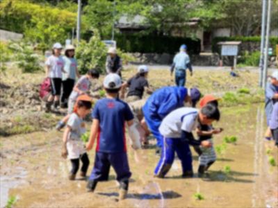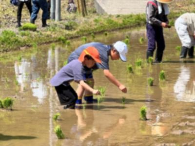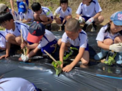 5年生は総合的な学習の時間に米作りについて学習しています。その学習の一環として、田植え体験を行いました。また、ふるさと学習、体験学習の充実を図るため、今年から4年生も一緒に田植え体験を行いました。