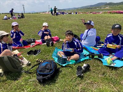 その後、空港公園へ移動し、たて割り班でお弁当を食べました。お弁当を見せ合ったり、普段はできないような会話をしたりと、どの子も楽しむ様子が見られました。その後のたて割り遊びでも、6年生を中心に「だるまさんがころんだ」など楽しんで活動する姿が見られました。
