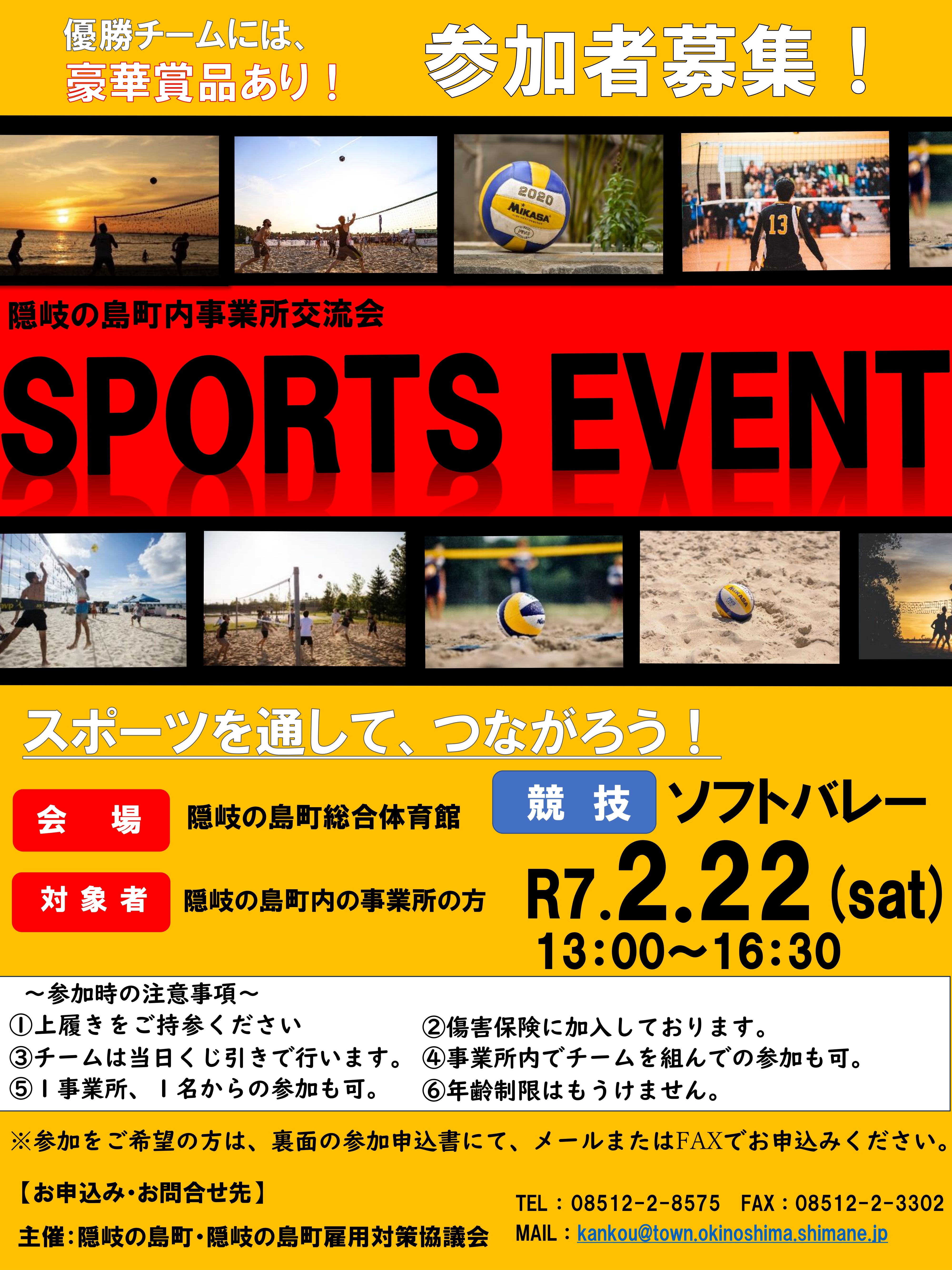 令和7年2月22日(土) 13:00~16:30 会 場 隠岐の島町総合体育館 レインボーアリーナ ソフトバレー ※優勝チームには豪華賞品がございます。 ※大会当日は傷害保険に加入します。