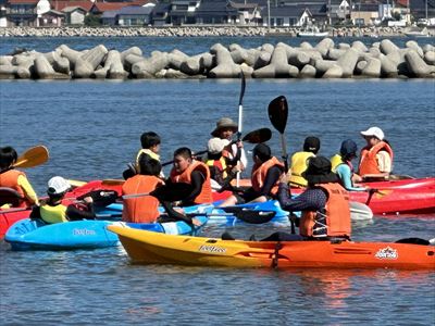 2日目は、塩の浜に移動してシーカヤック体験を行いました。かなり沖の方まで漕いで、海から都万の景色を見ることができ,感動しました。