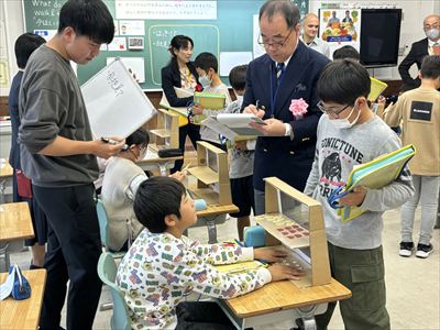 2年生は、都万の町探検で学んだことについてクイズを交えて発表し、3年生はサンテラス見学で見つけた工夫を紹介しました。