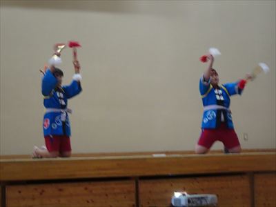 その後、発表会が始まりました。都万小の2人は、釜屋の山口さんに教えていただいた銭太鼓「ええじゃないか」を発表しました。がんばった姿をいろいろな人からほめていただき、自信になりました。他の学校の発表も、楽しく素晴らしくあっという間に時間が過ぎました。