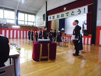 3月15日、卒業式があり、13名の6年生が卒業しました。6年生の別れの言葉は、「将来なりたい職業・そうなるためにどうするか」などを一人一人が気持ちを込めて発表しました。会場中が温かい雰囲気に包まれた中、6年生は退場し、卒業式は終わりました。