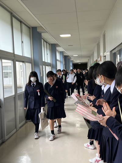 3月12日(火)に令和5年度卒業証書授与式が行いました。式の中で、前生徒会会長が読み上げた答辞は、3年間の思い出と仲間たちや保護者の方々、先生方への思いが詰まったとても感動的なものでした。また、式の最後の校歌では、涙で歌が歌えなかった卒業生もいましたが、その分在校生が大きな声で歌い、卒業生をしっかりと送り出すことができました。卒業生の進路は様々ですが、それぞれが進んだ道の先で活躍することを願っています。また、20日(水)には、12日に出席できなかった卒業生を対象に、第2回卒業式を行いました。