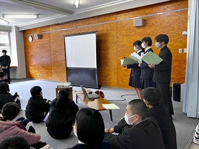 3月15日に1・2年生が初めて自分たちで企画・準備した予餞会が開かれました。今年度はインフルエンザが流行した影響で、卒業式後の開催となりましたが、各部活動の出し物や思い出のスライドショーなど、1・2年生の「お世話になった3年生に喜んでもらいたい」という気持ちの伝わる心温まる会になりました。3年生が心から楽しんでいる姿が印象的でした。
