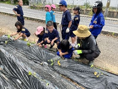 5月30日、保育所の年長・年中さんと五箇小学校の1・2年生でさつまいもの苗さしを行いました。園児さんが来るのを楽しみにしていた1・2年生。はじめは「難しい。」という声も聞こえましたが、やっていくうちにどんどん慣れて、子供たちだけでも上手に苗をさせるようになっていました。また、畑の整備から畝たて、苗さしなど地域の方々にお手伝いをしてもらったおかげで、楽しく活動することができました。秋には育った芋を収穫して焼き芋を行う予定です。