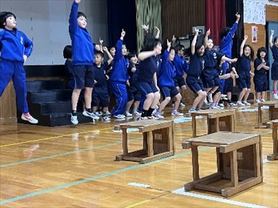 好きな食べ物や将来の夢を発表した1年生。夢を目指して五箇小学校で楽しく学んでほしいです。2~6年生は、各学年で出し物をして1年生を歓迎しました。ダンスやクイズなど1年生に楽しんでもらい、みんなで温かい迎える会にすることができました。