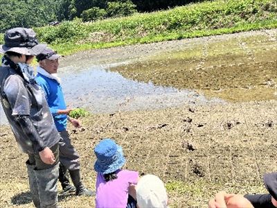 6月12日、5・6年生で田植えを行いました。地域の方のアドバイスをしっかりと聞き、スムーズに田植えをすることができました。農業のおもしろさと大変さを味わう貴重な体験となりました。小さな苗がこれからどんな成長を見せるのか、子供たちは秋の収穫をとても楽しみにしています。