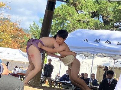 11月3日、五箇地区相撲大会がありました。今年も女子も男子もたくさんの子供たちが出場しました。学年ごとや地区対抗の団体戦で取り組みました。土俵の周りでは、たくさんの子供たちや保護者さん、地域の方が応援し、白熱した試合が展開されました。