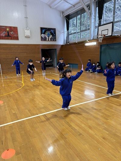 2月5日、校内なわとび大会がありました。色々な跳び方を決められた秒数生き残りで競争しました。競争は、縦割り班ごとなので、各色応援にも熱が入りました。冬の間のパワフルタイムで行っていた、大繩での8の字跳びも跳んだ回数で競いました。1年生はやっと大繩が跳べるようになったばかり、そんな1年生を上級生が優しくサポートする姿があり、とてもステキななわとび大会となりました。