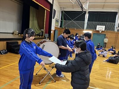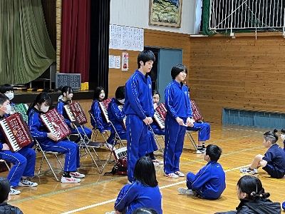 2月20日、校歌引継ぎ式が行われました。五箇小学校は、例年校歌伴奏を6年生が演奏しています。ピアノ・アコーディオン・大太鼓・小太鼓を演奏します。全校朝会や入学式・卒業式など様々な場面で演奏してきた6年生が、その役目を5年生へと引き継ぎます。五箇小学校の伝統の一つです。