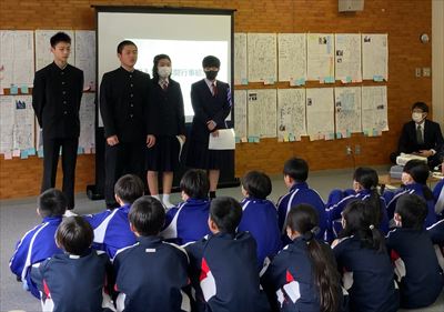 2月6日(木)に西郷南中学校の一日入学があり、町内の4つの小学校の29名の児童が参加しました。今年度は数学と理科の体験授業を行いました。初めは緊張していた6年生たちも時間が進むうちに柔らかな表情になっていきました。生徒会四役も、新入生に西郷南中学校のことを少しでも分かってもらおうと、工夫しながら学校説明を行っていました。新たなメンバーで始まる西郷南中学校がとても楽しみです。