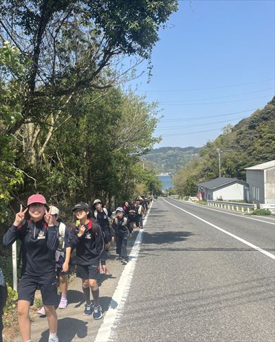 5年生は、歩いて大久地区に行きました。約11kmの長い道のりでしたが、みんなで励まし合い完歩しました。大久交流センタ―(旧大久小学校)でお弁当やおやつを食べ、思いっきり遊びました。