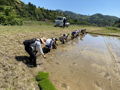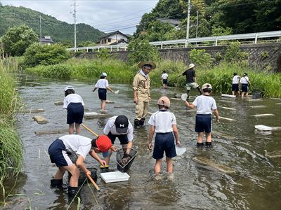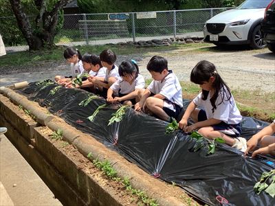 本校ではふるさとを知りふるさとを好きになるよう、毎年たくさんの方に協力していただき体験活動をしています。写真にある1・2年生のいも苗の植え付け、4年生の川の調査、5年生の田んぼでの学習をはじめ、毎年行っている天然記念物ヤマネの調査、地域の行事の調べ学習、各種施設や産業の見学など各学年で実施しています。