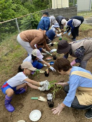 5月22日(木)に村上地域コーディネーターとまにの里の方々をお招きして、2年生が野菜の苗植えをしました。昨年の経験を覚えていたようで、順調に作業することができました。苗をポットから取り出すところは少し難しかったようで、おばあちゃん達に手取り足取り教えてもらって畑への植え替えをしました。最後は、元気に育ちたくさん実るように、たっぷりと水やりをしました。