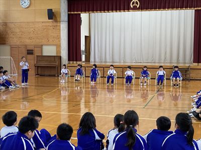 4月23日に6年生が企画・運営をし、1年生を迎える会を行いました。1年生の笑顔が溢れる会を目指し、当日までに6年生を中心に準備をしてきました。迎えた当日は、1年生へのインタビューから始まり、次々に得意なことを発表しました。バスケット、サッカー、なわとび、ビートボックス、ピアノなど、少し照れながらも全校の前で披露する1年生の姿に全校児童は釘付けでした。会の後半は、「もうじゅうがりに行こうよ」「こおりおに」をして楽しみました。1年生はもちろん、全校児童の笑顔が溢れる迎える会となりました。