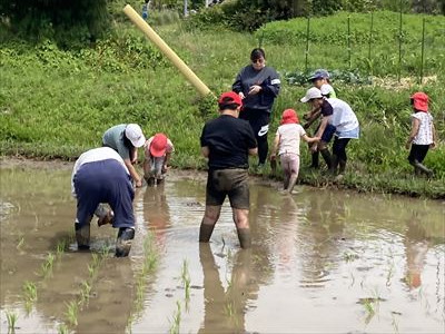 5年生は総合的な学習の時間に米作りについて学習しています。その学習の一環として、田植え体験を行いました。ふるさと学習の深化を図るため、4年生から一緒に田植え体験を行っています。今年も下西八百杉会の皆さんにお世話になり、田植えのやり方を丁寧に教えていただきました。また、5年生は下西保育所の年長さんと交流し、年長さんのサポートをしながら一緒に田植えを行いました。どろんこになりながらも楽しく田植えをすることができました。