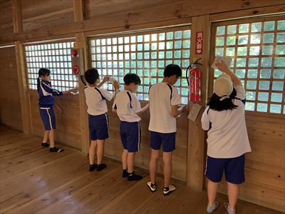 5月27日に、4~6年生で玉若酢命神社の清掃を行いました。これは、隠岐三大祭の一つである御霊会風流の前に行っている行事で、地域の一員としての役割を果たし、ふるさとへの愛着を深める大切な活動です。子ども達は、雑巾やたわしを手に、拝殿の床や階段、本殿、石の柵などを約1時間かけて掃除しました。真っ白な雑巾が真っ黒になるまで、時間いっぱいがんばる姿が見られました。きれいになった神社を見る子ども達の表情からは、地域の一員として貢献できた満足感が伝わってきました。