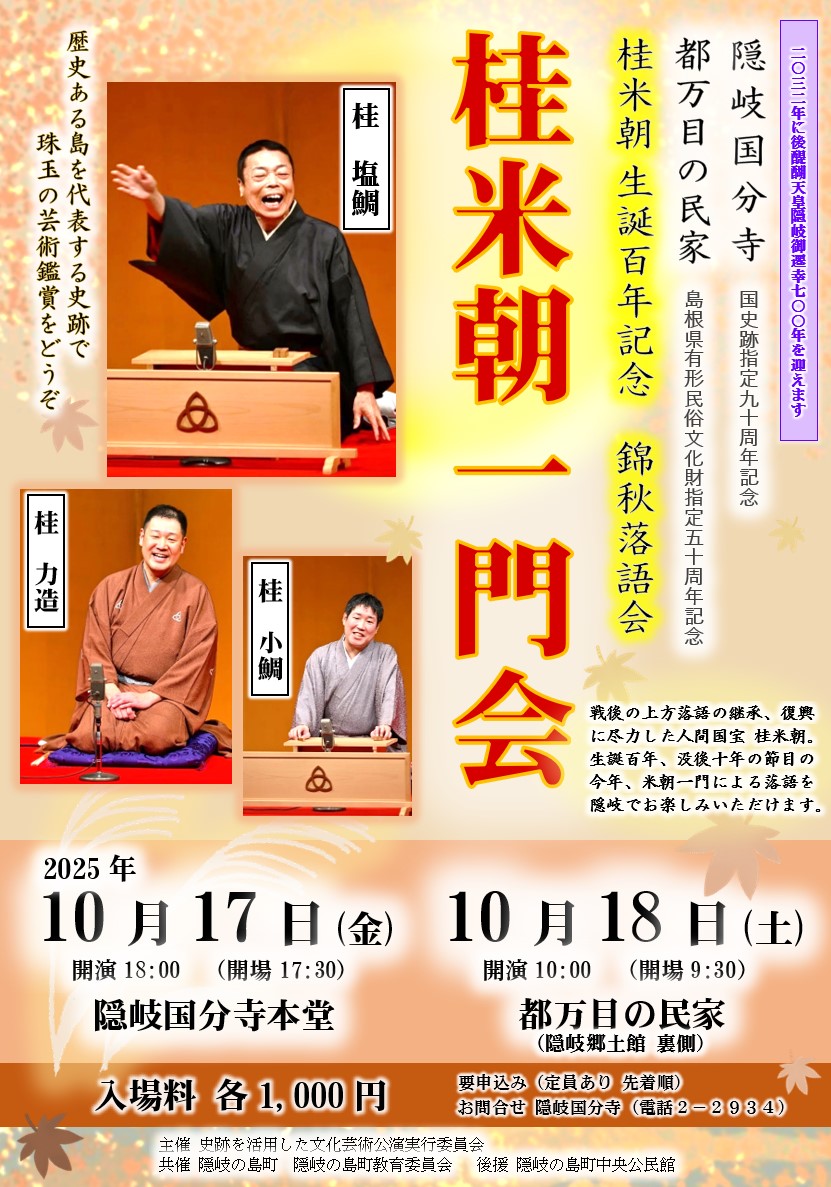 隠岐の島町内にある文化財を活用して落語会を開催します。