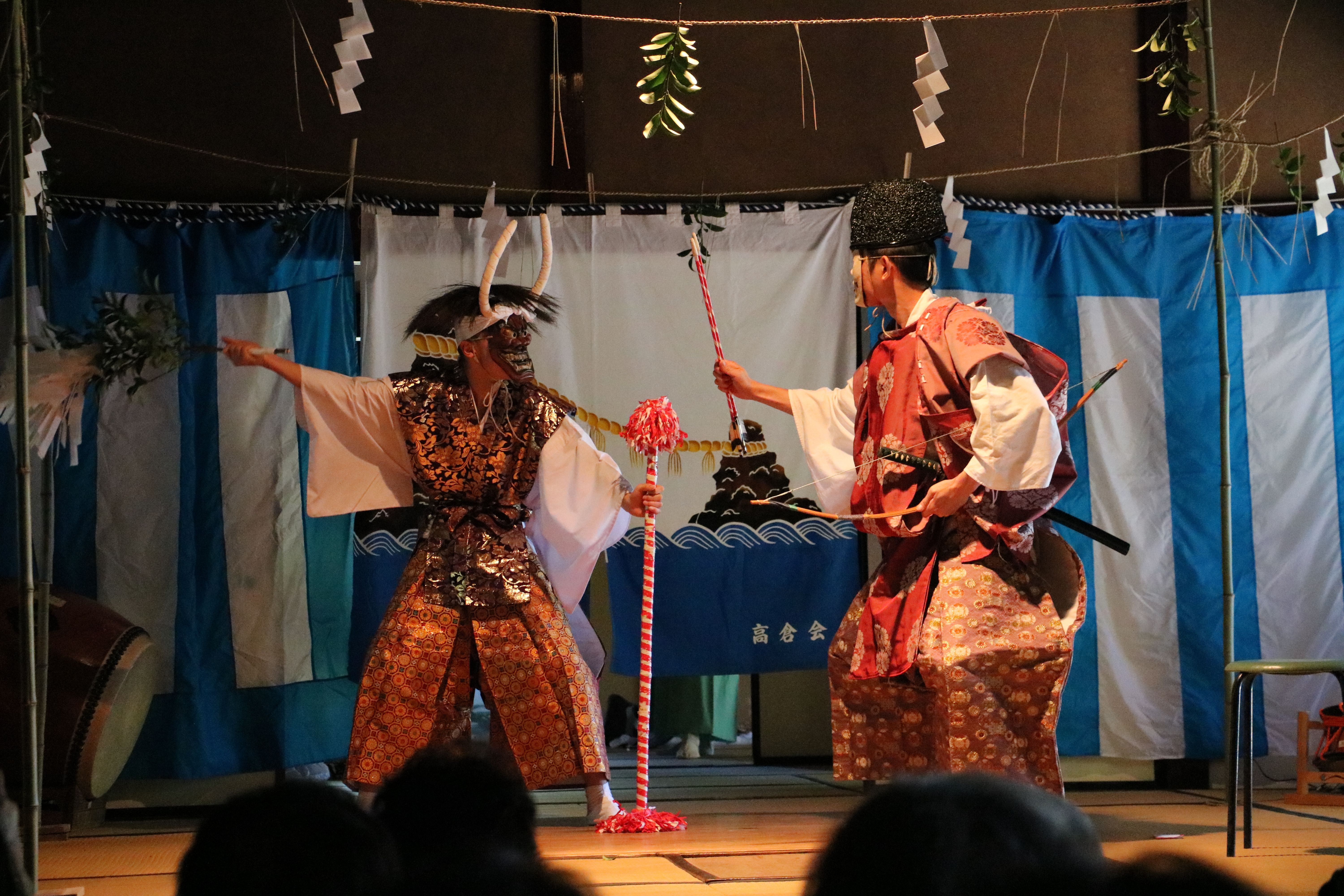 矢を抜こうとして苦しむ鬼の姿、鬼の首を取って 勝利の舞を誇らしげに舞う弓矢八幡の姿が印象的な舞。