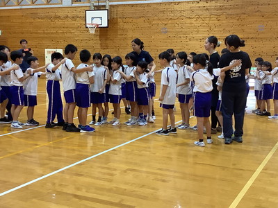 9月17日に立命館大学の学生と交流しました。昨年度も来てくださった学生と、新しく来られた2名の計3名と全校児童が交流しました。出会いの会では、大学生の特技であるバトントワリングとバスケットを披露してもらいました。バトントワリングは、初めて見る競技であり、歓声があがっていました。また、高学年は、バスケット交流会に向けてバスケットの基礎を教えてもらいました。給食、昼休憩も大学生を誘って一緒に遊んだり話したりするなど楽しく有意義な時間を過ごすことができました。今年で3回目となるこの交流。毎年様々なスポーツに出会うことができ、子どもたちにとって忘れられない時間となりました。