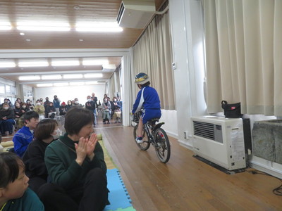 12月5日に西郷中学校で、フレンズ合同学習「なかよし発表会」が行われました。磯小学校からは、あおぞら学級・ひまわり学級・たいよう学級が参加し、日ごろの学習の様子を発表しました。「思い出のアルバム」と題して、3学級それぞれがこれまでに学習してきたことをリレー形式で発表しました。あおぞら学級は重い箱を「おしておして」、どちらが早くゴールできるか、お父さん・お母さんと勝負しました。ひまわり学級はこれまでの思い出を集めて作ったオリジナルの「思い出すごろく」をやって見せました。たいよう学級はこれまで練習してきた自転車に挑戦しました。成功した瞬間には、大きな拍手と歓声が上がりました。