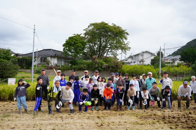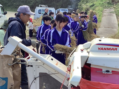 10月7日に4・5年生が稲刈り体験をしました。今年度も八百杉会の方々にお手伝いいただき、鎌を使って刈り取ることができました。また、11月4日には下西保育所の年長さんと一緒に脱穀も行いました。山形屋さん、都万の高宮さんに機械の使い方などを教わりながらたくさんの稲を脱穀していきました。