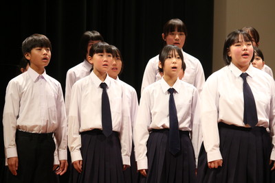 混声3部合唱「世界を変えるために」「未来へ」の2曲を全校生徒で歌いました。どちらも生徒の伴奏(ピアノ)にのせて、五箇中らしい力強く声量のある合唱を披露できました。音楽会に至るまでの期間は、全校でコツコツと練習を重ねてきましたが、昼休憩等にどこかしこで歌声が聞こえたり、ピアノの音色が聞こえたりしていました。歌うことが好きで、合唱を楽しめる生徒たちの姿に五箇中学校の伝統を感じます。
