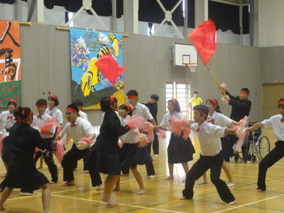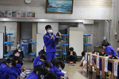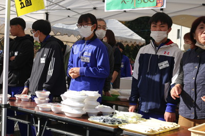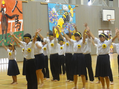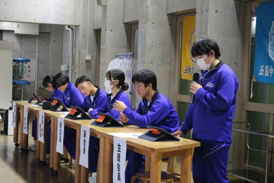 五箇どんと祭りに全校で参加しました。会場の準備・片付け、食事スペースの衛生管理、ステージ発表での合唱披露などを行いました。オープニングイベントにも参加し、餅投げや五箇音頭を地域の方と共に楽しみました。来場された方々から「中学生がテーブルを拭いたり、お箸を補充したり、一生懸命働いていて、ありがたかったです」「中学生による五箇音頭がすばらしく、見入ってしまいました」「中学生の合唱は、とてもすがすがしく、よい歌声でした」など、うれしいお言葉をたくさんいただきました。