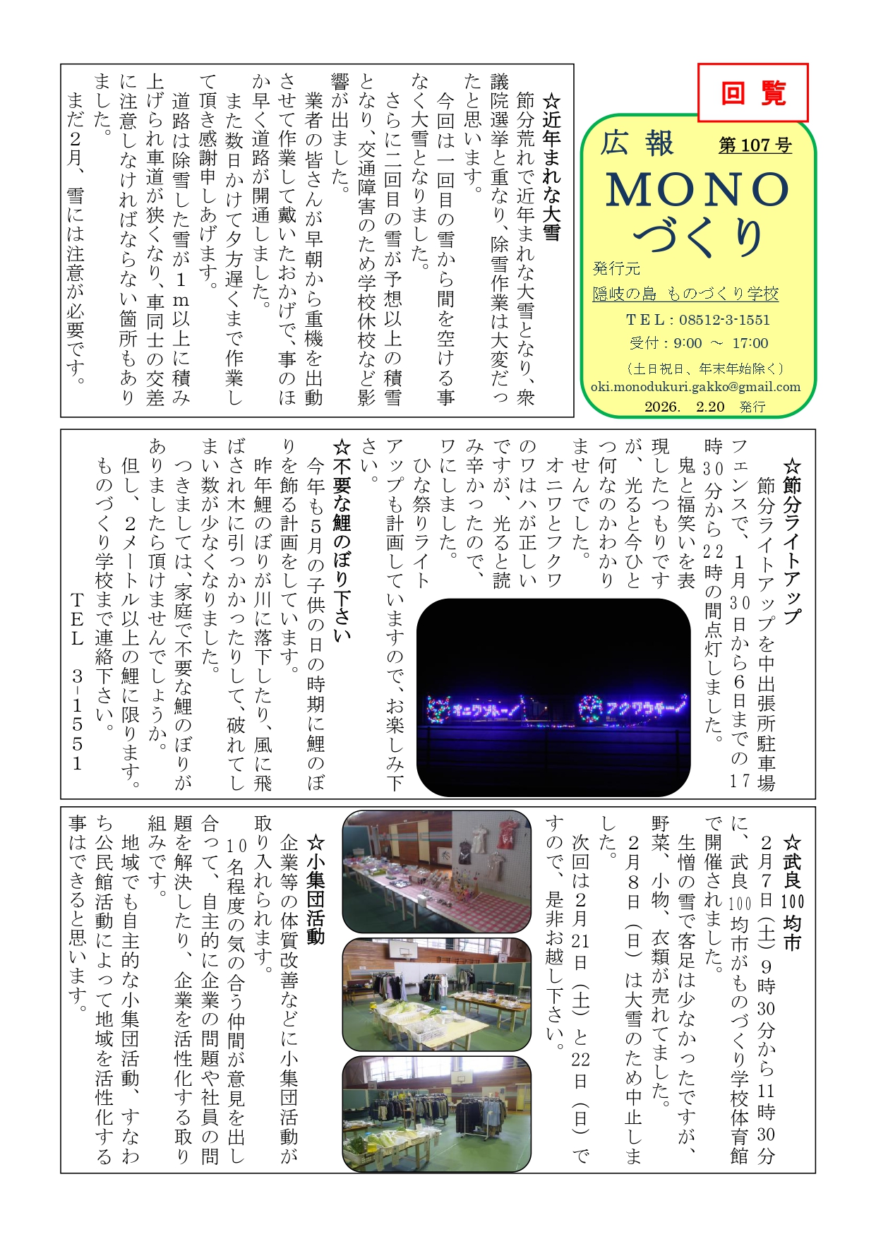 隠岐の島ものづくり学校では、毎月管理人による活動新聞「広報MONOづくり」を発行しています。