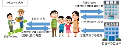 ふるさと納税を行うと 寄附金のうち2,000円を超える部分について、その年の所得税と翌年度の住民税から控除を受ける事ができます。ただし、収入や家族構成によって控除の上限額があります。控除を受ける場合は、確定申告を行う必要がありますので、本町から送付する寄附金受領証明書又は振込用紙の控え(郵便振替の場合)をご利用いただき、申告手続きを実施してください。