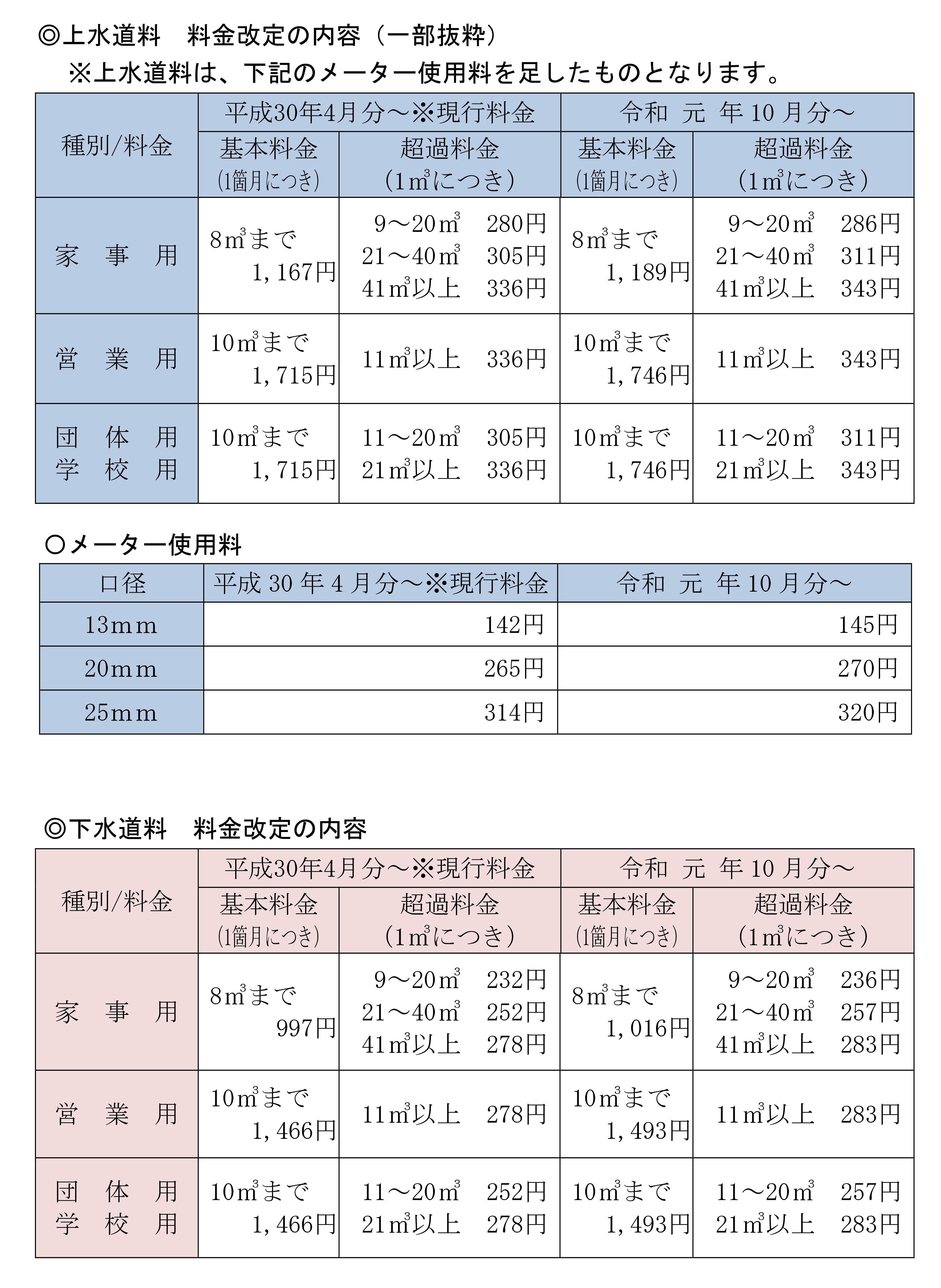 令和元年10月改定の水道料・下水道料金表は、下記のPDFファイルでご覧ください。