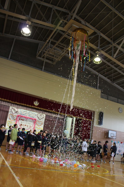 6年生が1年生と手をつないで入場し、心のこもった飾り付けがされた体育館の中で「ありがとうカーニバル」が開催されました。どの学年も「ありがとう」と「頑張れ」という思いがたくさん詰まったすてきな出し物でした。初めて学校全体を動かすという大仕事を終えた5年生は、やり遂げた達成感に満ちた表情でとても満足そうでした。