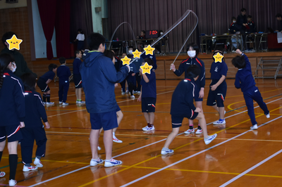 低学年1分、中学年2分、高学年3分とタイムが長くなっていく前跳びは、応援を力にみんながかっこいい姿を見せてくれました。長縄3分間8の字跳びは、低学年が跳びやすいように声をかけたり、速さを調節したりするなど、高学年の優しさが感じられました。