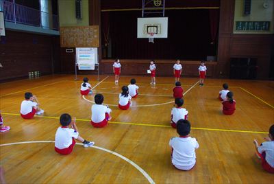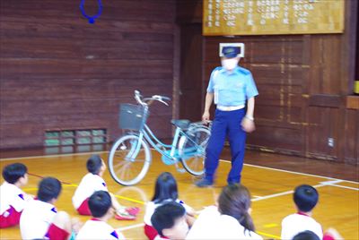 7月14日(火)に、警察署の新田さん、駐在所の安部さん、交通指導員の春木さんの協力のもと、交通安全教室を実施しました。当日はあいにくの悪天候で屋外ではできませんでしたが、「自分の命を守る為の大切な授業」として、室内でできることに真剣に取り組みました。まず、自転車の乗り方について、乗る時のポイントを確認しました。ポイントとしては、(1)自転車の左側に立つこと、(2)乗る前に後方を確認すること、(3)こぎ出す前にもう一度後方を確認することなどです。次に一時停止の仕方や、障害物があった時のよけ方など、実際の路上を想定して、安全を確かめながら乗ることの大切さを教わりました。次に、2つのグループに分かれ、交互に活動していきました。前者は、教わったポイントを活用しながら実際に自転車に乗って練習しました。後者では、DVDを見ながらクイズを交えて、様々な場面における正しいルールについて考えました。最後に、いかにヘルメットが重要であるかについて、豆腐を用いた実験を通して理解を深めました。人間の脳みそを豆腐に代え、Ⓐ水の入った袋の中に豆腐を入れて床に落とした場合と、Ⓑヘルメットで覆って落とした場合とを比べました。結果は一目瞭然で、Ⓐでは豆腐が砕けてしまったのに対し、Ⓑでは衝撃が吸収され、砕けることはありませんでした。ヘルメット一つで身を守ることが可能であるということを目の当たりにすることができました。子どもたちからも、「ヘルメットがどれだけ大切かが分かった。」「今日学んだことをこれから生かしていきたい。」というような感想を聞くことがでました。これから長い夏休みが始まり、自転車を利用する機会も増えることと思います。今回学んだこと大切にして、交通安全に心がけて、安全第一で過ごしてほしいと思います。