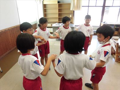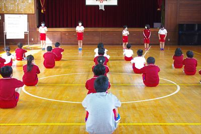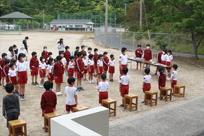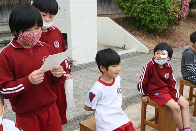 5月22日(金)に新しく都万小学校の仲間となった1年生のために6年生が中心となって企画した「1年生を迎える会」を行いました。コロナウイルスの影響で中止も検討されましたが、6年生の強い思いで校庭での開催となりました。会では、1年生から6年生が縦割りで活動する「縦割り班開き」も同時に行いました。1年生のことをより知るためにインタビューをクイズ形式にしたり、縦割り班で一緒になって楽しむために「ジェスチャーゲーム」をしたり、全校が仲良くなるための工夫が多く見られる会になりました。都万小学校は6年生のおかげでいいスタートを切ることができました。
