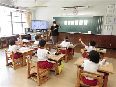 今年から、5・6年生は正式な教科として週2時間の外国語科がスタートしました。また、3・4年生も週1時間、外国語活動として取り組んでいます。それに合わせ、6年生の外国語には西郷小学校より濱田先生に、また、ALTとしてアリエル先生にお越しいただき、指導していただいています。ゲームや歌など、様々な言語活動を通して外国語に慣れ親しみ、コミュニケーションの基礎的な力を身に付けています。その中で、先生や友達の言っていることが理解できた、自分の言いたいことが伝わったなど、子供たちが喜びを感じている場面や、「これを英語で言いたい。」と自発的な姿が見られると、何だかこちらも嬉しい気持ちになります。外国語におけるコミュニケーションの四大奥義は、「アイコンタクト」「ジェスチャー」「笑顔」「リアクション」なのだそうです。写真はある日の授業の一コマです。アリエル先生からのクエスチョンに、ジャスチャーを交えながら、自分たちの考えを表現しようとしている姿が印象的です。四大奥義を体現している姿を窺うことのできた時間でした。このような姿を大切にしながら、子どもたちの力を伸ばしていけたらと思います。