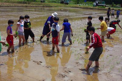 昨年度に引き続き、井川寛さんにお世話になり、5・6年生が、田植えの体験をさせていただきました。6年生は2度目ということで、苗を運ぶ手伝いをしたり、手際よく苗を植えて次の列に移ったりと活躍していました。5年生は、初めて田植えを体験する児童が多く、田んぼの感触を確かめながら恐る恐る入りましたが、植える作業は楽しいと言いながら植えていました。手植えの後は、一人一人田植え機に乗せていただき、機械での田植えのスピードを実感できました。どろんこ遊びもさせていただき、大変充実した時間を過ごさせていただきました。稲刈りまで、みんなで見守っていきたいと思います。