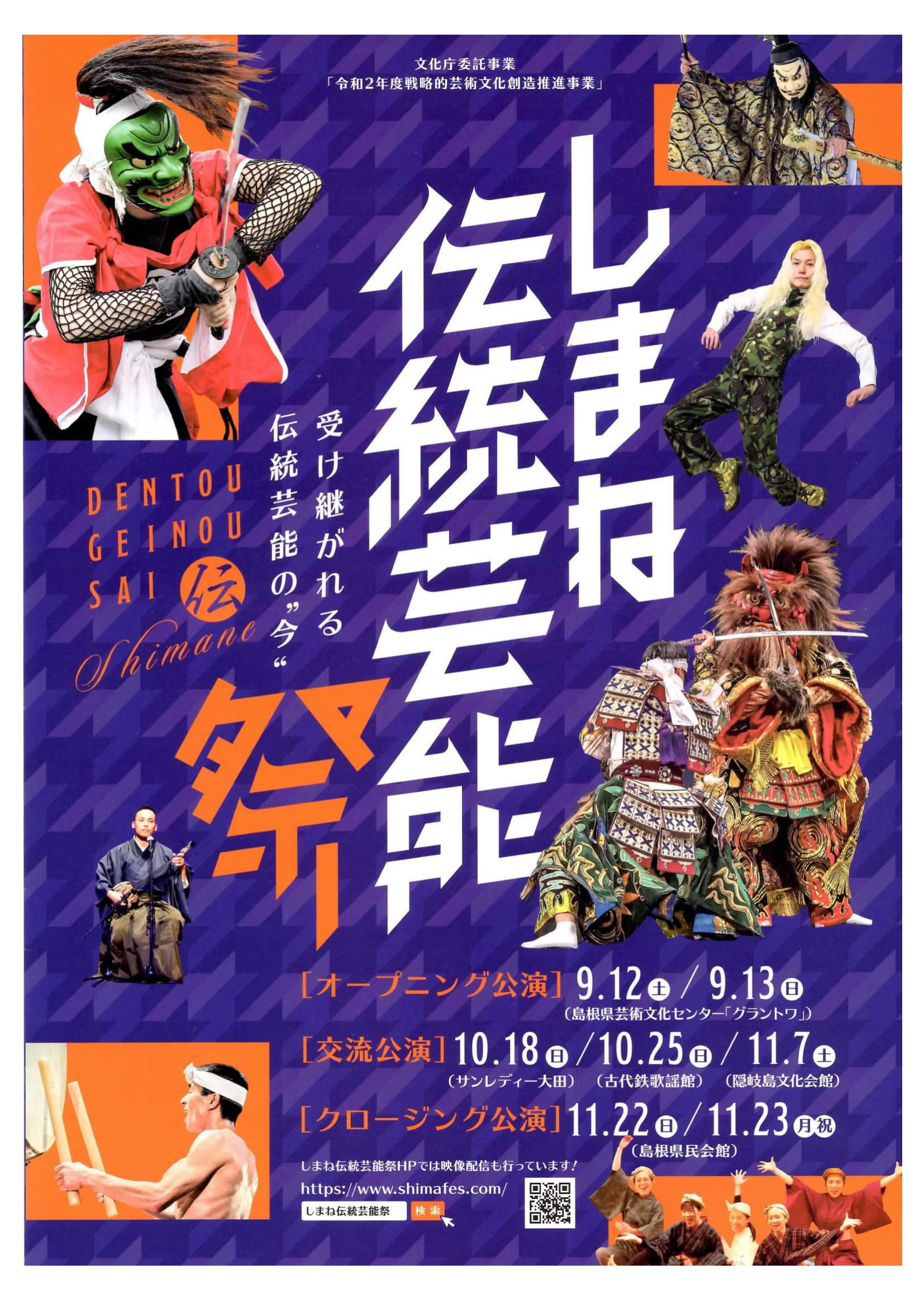 「しまね伝統芸能祭」は、主に島根県内で継承されている伝統芸能を公演や映像での発信、現代アーティストとのコラボレーションなど様々な形で紹介し、その魅力を伝えてくもので県内各地で開催されています。