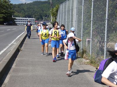 10月1日(木)は、今年度初めての遠足に出かけました。行先は旧飯田小学校です。1~4年生で縦割り班に分かれ、片道約3.5kmの道のりを往復歩きました。4年生のリーダーが、長い距離を歩くのが初めての1年生や下学年を引っ張りました。