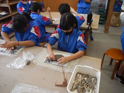 初めに、土の特性や練り方のコツなどを分かりやすく説明していただきました。6年生は昨年の歴史学習とのつながりのある内容ということもあり、興味をもって聞くことができました。