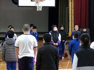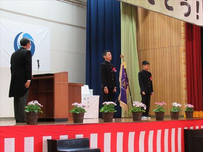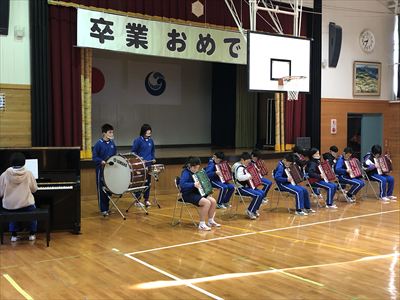 式の最後には、伴奏に合わせて、最後の校歌を全校で歌いました。晴れ姿へのお祝いとこれからの中学校生活へのエールをこめて在校生と教職員全員で見送りました。拍手の中、一人一人が立派に学舎を後にしました。
