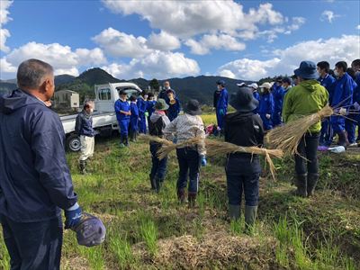 10月21日に5・6年生が稲刈りを行いました。田植えに続いて稲刈りも、地域の方をはじめ、国際交流員やALTの方などたくさんのボランティアの方が協力してくださいました。3人1組でチームを組み、稲を刈る人と縛る人に分かれて行いました。なかなか難しい作業でしたが、地域の稲刈り名人の方に教えてもらいながら一生懸命頑張りました。また、縛ったひもが緩んでいるのを見つけて縛ったり、落ちている穂を拾って集めたりと、自分で考えて行動する姿も見られました。「地域の方に教えてもらいました。」「優しく声をかけてもらいました。」といった感想も聞かれ、ボランティアの方とのよい交流になったことが伺われました。