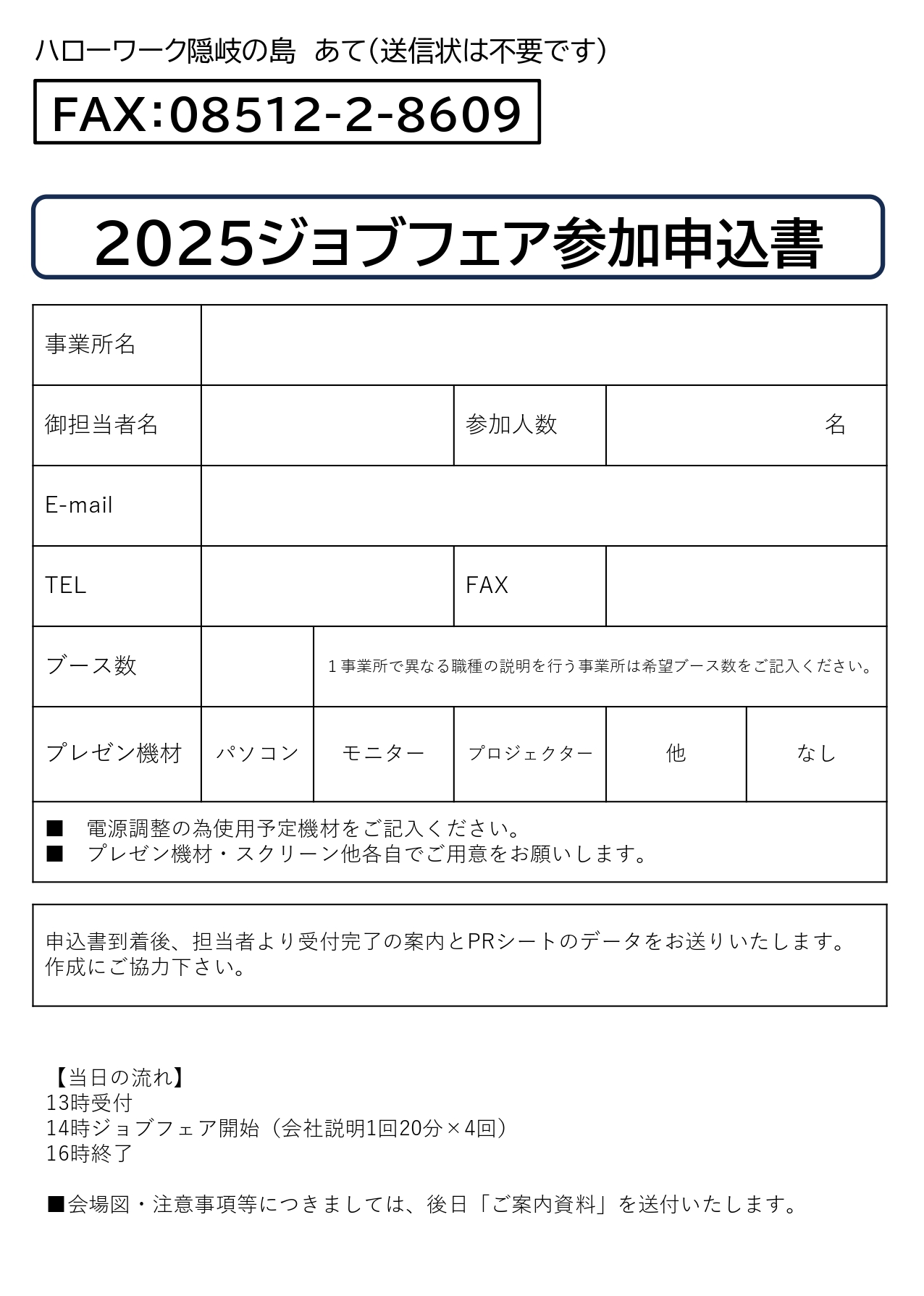 令和7年3月28日(金)までに、参加申込書をハローワーク隠岐の島宛てにFAXでお送りください。